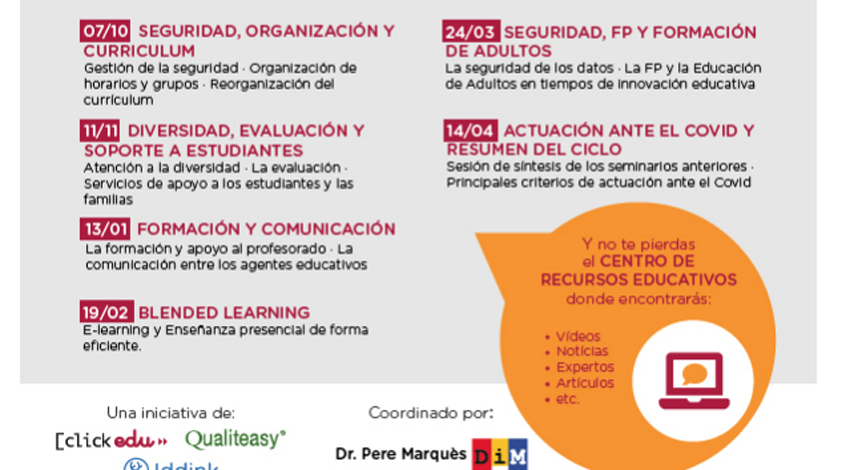 Este seminario virtual, que tendrá lugar el día 13 de enero, pertenece a un ciclo que comenzó en octubre, bajo el nombre de “Para una Educación disruptiva en tiempos del COVID”, dirigido por el doctor Pere Marquès, con el fin de proporcionar a los centros criterios de actuación.
