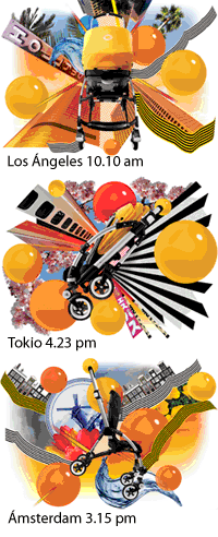 Las tres ilustraciones de Mat Maitland aluden a diferentes funcionalidades del cochecito, cada una de ellas representando a uno de los tres pilares claves del nuevo Bugaboo Bee; crece, compacto y cómodo. Bajo el telón de fondo de tres ciudades del mundo (Los Ángeles, Tokio y Ámsterdam) el espíritu del Bugaboo Bee queda reflejado a través de sus diseños enérgicos y juguetones.