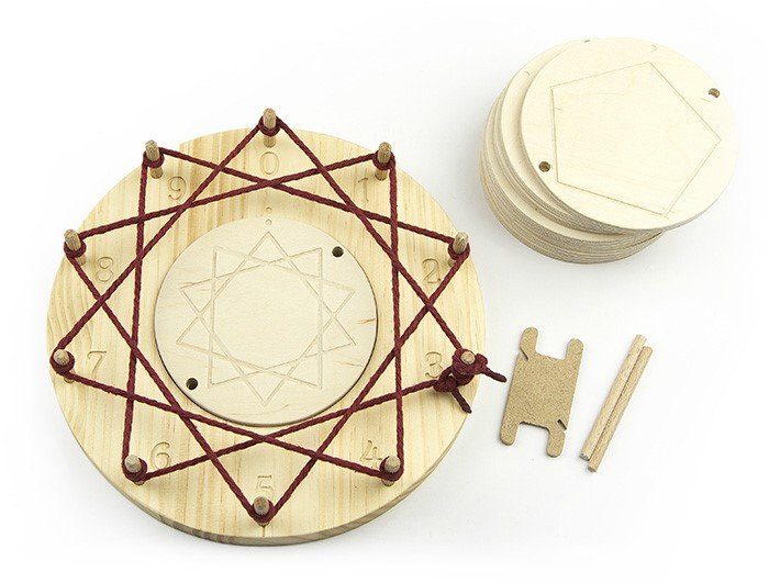 Para las tablas de multiplicar, utiliza “el círculo de la multiplicación”, un enfoque artístico que relaciona números y patrones de manera tangible. Se puede comprar aquí. Pero también es fácil de hacer, con una tabla redonda de madera o corcho, 10 chinchetas, etiquetadas del 0 al 9, pinchadas en la circunferencia del círculo formando 10 partes iguales y una cuerda. Para representar una tabla de multiplicar, se fija la cuerda con un nudo en la chincheta número 0, por ejemplo, para la tabla del 2 se va sujetando la cuerda de 2 en 2 números, la del 3 de 3 en 3 números, etc. Obteniendo así las siguientes formas: