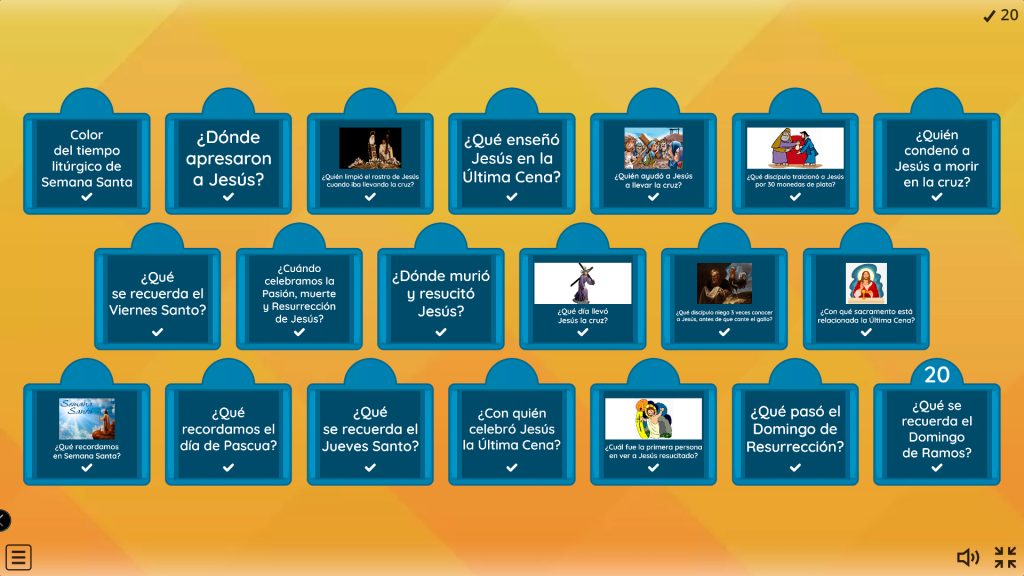 Para que los más pequeños practiquen por su cuenta, pueden ser útiles algunos juegos interactivos publicados por profesores de Religión en Wordwall, particularmente interesante para poner a prueba los conocimientos de personajes de la Pasión es el Abrecajas preparado por Aurora Martín.