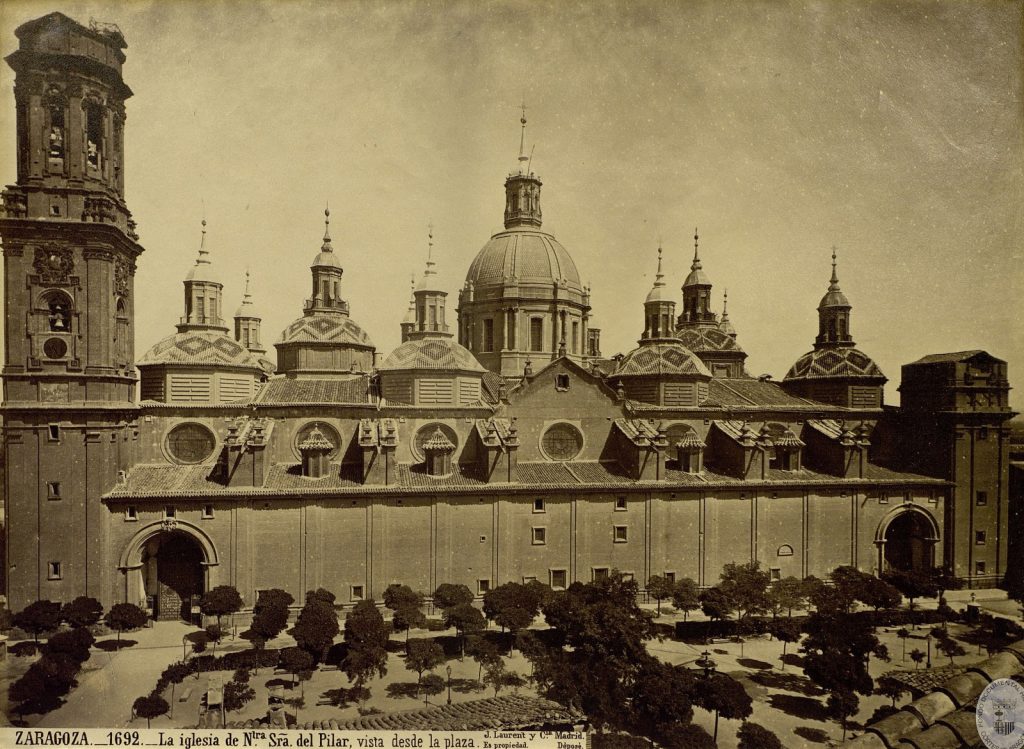 5. Torre de Santiago, en la Basílica de El Pilar de Zaragoza: La que durante dos siglos fue única torre de la Basílica de El Pilar de Zaragoza, en su lado suroeste (la esquina de la puerta alta de la plaza, la más lejana a la Seo o Catedral), aunque fechada en 1692, carecía de chapitel para rematar su campanario cuando J. Laurent tomó (hacia 1870) esta fotografía. Supuestamente se terminó en 1892, pero todavía en la portada de una revista de 1920 aparece sin ese característico remate que eleva las cruces más altas del templo hasta casi los 90 metros. La segunda torre (de Nuestra Señora) se terminó en 1907, y contiene la campana de ocho toneladas que había estado en la Torre Nueva de Zaragoza y que alertó a la población de los ataques franceses durante los asedios de 1808 y 1809; la tercera (de Santa Leonor) en 1949 y la última (de San Francisco de Borja) en 1961. Solo las dos primeras son campanarios, y lo mismo que la cúpula que durante mucho tiempo fue la parte más alta del templo, las rematan sendas cruces.