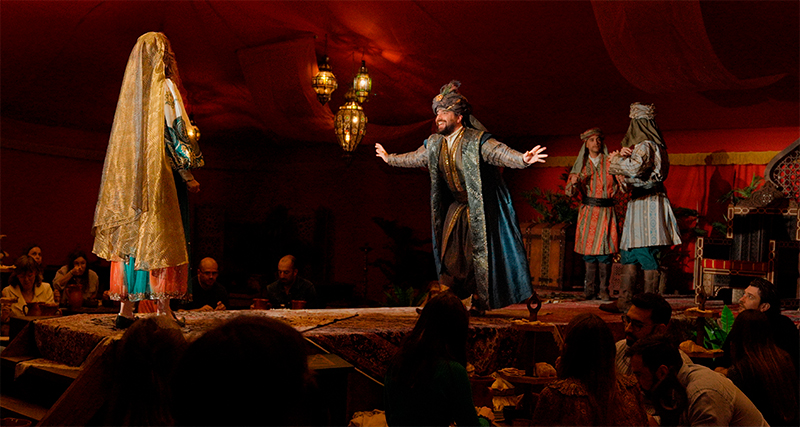 Los espectáculos que se desarrollan dentro de restaurantes son el del Bodegón del Capitán y el del Salón Califal. El primero está inmerso en Villanueva del Corral, modelado al estilo de un pueblo del siglo XVI-XVII. Allí se puede experimentar la gastronomía del pueblo toledano de Gálvez mientras se deja uno sorprender por las aventuras de un capitán veterano de los Tercios Viejos de esa época. En el Salón Califal, además de los menús, se ha preparado una fiesta para celebrar las aspiraciones de un visir, llamado Hudary, que pretende ser califa. Pero antes tendrá que pasar por cuatro pruebas que ha preparado la hermosa Salama, hija de Abderramán, el califa del que pretende independizarse el visir.