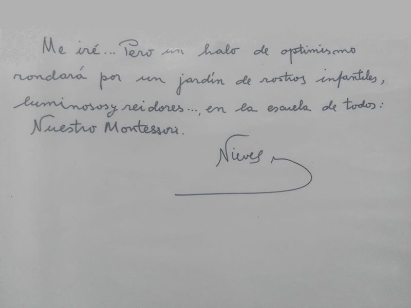En el recuerdo, unas palabras de él: “¡Os prometo que la escuela no cerrará jamás!”; sobre un papel, unos versos de ella, escritos de su puño y letra: “Me iré… Pero un halo de optimismo rondará por un jardín de rostros infantiles, luminosos y reidores…, en la escuela de todos: Nuestro Montessori”.