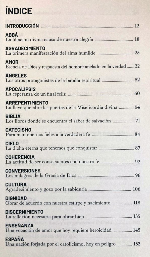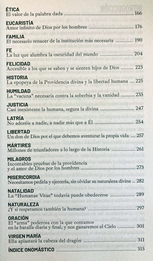 –De religión, espiritualidad y cultura. Porque la religión tiene una proyección en todo lo humano. Porque es lo que mi corazón me pide; mi corazón y mi inteligencia. Yo he tenido que escribir muchos libros y de todo. Sobre periodismo: documentación, teoría del periodismo. Pero una vez que ya me jubilé y que ya había terminado los proyectos de investigación, de docencia, lo que hice fue discernir y preguntarle a Dios –hay una voz que es discernimiento–, preguntarle a Dios en la adoración qué tenía que hacer. Y vi muy claro que lo que tenía que hacer es escribir sobre los temas importantes que o se han olvidado o que están tergiversados por el materialismo imperante. En la palabra materialismo se puede resumir el progresismo, que es un regreso a la barbarie, como digo en el libro. Eso que la gente llama progresismo es un regreso a la barbarie, con tecnología punta, eso sí. Vi que tenía que hablar de Dios, de las personas humanas, de los cristianos y de nuestra acción coherente. Me hice una lista de temas y salían unos 100 temas sobre los que he estudiado más, sobre los que he investigado y leído más, de los y puedo escribir con cierta autoridad. Me acordé de Guitton, ese filósofo que era amigo de Pablo VI y que escribió tantos libros buenísimos, que decía que un libro verdadero era aquel que era útil. Guitton no hablaba de la utilidad como el utilitarismo británico, sino que hablaba de que todo libro tendría que lograr un enriquecimiento moral, un enriquecimiento cultural y espiritual de las personas que lo leyeran. Con esas perspectivas empecé a tachar palabras y al final me quedé con 33 de las que yo había tenido experiencia vital en oración. Empecé a escribir encomendándome al Espíritu Santo, diciéndole: «Señor, que todo lo que escriba sea para tu gloria, para el bien de las almas». Empecé a escribir y aquí está el libro.