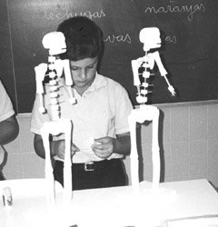 “Ahora toca unir el cúbito y el radio al húmero para que el brazo quede en perfectas condiciones…”, dice el profesor a los alumnos de 2º de Primaria del Colegio “Aitana”, de Alicante. Pero, no hay que asustarse. No es que el centro haya improvisado un quirófano para que los chicos operen como si de expertos cirujanos se tratase. Simplemente están construyendo –dentro de la unidad didáctica El cuerpo humano– unos esqueletos con corcho blanco, palillos y papel para aprender cómo es su cuerpo y conocer la utilidad de algunos de sus órganos. El material necesario para llevar a cabo esta humana tarea ha sido elaborado por los profesores Juan José Aranda, Caprasio Martínez y Jesús Alonso con la ayuda de unas plantillas de madera y una máquina que han preparado para facilitar el trabajo. Ahora sólo hay que seguir un orden de operaciones lógico: