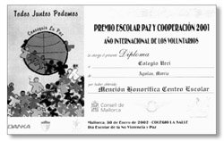 El CP “Urci” de Águilas, Murcia, está de enhorabuena por su defensa de la paz. Y es que los niños del segundo curso de Primaria, dirigidos por su profesora María Hernández Sánchez, han recibido una mención honorífica por su participación en el Premio Escolar Paz y Cooperación del pasado curso.
