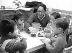 “Las ventajas son, fundamentalmente, que al ser pocos alumnos puedes trabajar adecuadamente con ellos. Además, al estar en su propia casa, los niños se sienten muy cómodos”. No obstante, Cuca, la maestra, cree que hay que tener mucha iniciativa y echarle imaginación, porque “los materiales que tenemos son los propios juguetes de los niños o algunas baratijas que compramos”, afirma, y advierte que “se echa en falta algún tipo de subvención para materiales, o protectores para los niños contra los accidentes domésticos”, por ejemplo, ya que es la propia maestra quien va recogiendo a los niños casa por casa sin que los padres tengan que preocuparse de nada mientras juegan y trabajan tanto en el cuarto de estudio como en el jardín.