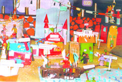 Por otra parte, sugerimos a los niños la construcción de la maqueta del país de los cuentos. La idea fue muy bien acogida y cada alumno eligió libremente un cuento tradicional para colaborar fabricando sus personaje de plastilina, las casas y castillos, la muralla, el aeropuerto, la estación de ferrocarril, el puerto, los jardines, la Plaza de la Cenicienta… Se utilizaron materiales de desecho (cajas de leche vacías, rollos de papel higiénico, palos de polo…), papeles de colores, cartulinas, etc.