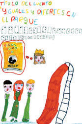 Tras adivinar palabras, los niños pasaron a averiguar un saludo y su respuesta (por ejemplo, “hola, niños” y “hola, seño”). El siguiente paso consistía en descifrar frases sobre actividades de dentro y fuera del aula (“¡Viva el Carnaval!”, “¡Feliz cumpleaños, Raúl!”). El trabajo en clase se completó haciendo un mural donde los niños pegaban sus dibujos, y un cuento en capítulos con las ideas de todos. Los dos trabajos cuentan una historia muy parecida: tres amigos, dos niños y una niña ciega, que se reunían en el parque para jugar y contarse aventuras. La niña enseña Braille a los niños y éstos a ella, a jugar al escondite. Así, iguales y diferentes, todos aprendemos de todos.