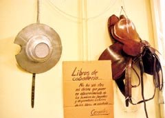 Por estos días, este salón de estilo clásico se ha convertido en un campo manchego con lanzas y armas de hidalgos, sombreros quijotescos y monturas auténticas. Además, se exhiben cuatro ediciones de El Quijote de finales de siglo XIX y varias acuarelas modernas en homenaje a dos personajes históricos, Quijote y Sancho Panza.