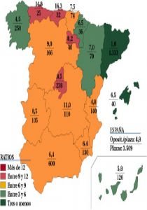 Esta circunstancia de pocos opositores se acentúa en aquellas comunidades con lengua propia en las que se exige el requisito lingüístico. Así, si la ratio nacional está en el 5,7 docentes por plaza, en Galicia, esta ratio es de 5,1; en el País Vasco, del 3,6; en la Comunidad Valenciana, del 3,7; 5,1 en Baleares y 3,1 en Cataluña.