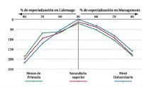 Como se puede apreciar en el gráfico 2, cuando un director se especializa en liderazgo (es decir, dedica un 70% de su tiempo a labores relacionadas con la docencia), consigue un efecto más equitativo, pues logra –en igualdad de condiciones– que los alumnos cuyos padres tienen como mucho estudios primarios se vean mucho menos afectados por sus desventajas de origen, aunque disminuye el impacto del capital familiar en todos los demás alumnos.