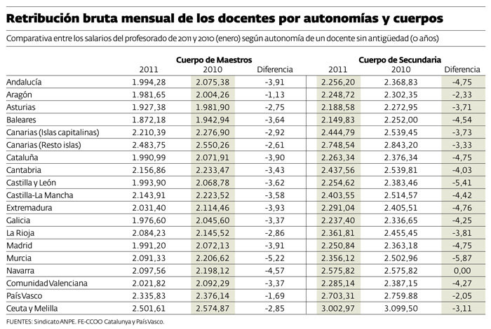 Todas las comunidades autónomas han reducido las retribuciones de los profesores respecto a enero de 2010, tras los recortes en los salarios de los funcionarios impuestos a mitad del año pasado por el Gobierno central. Estos recortes se aplicaron durante el segundo semestre de 2010 y, en la práctica, han supuesto un nuevo recorte para el año 2011. La clave está en que al aplicarse a mitad del año pasado, la primera paga extra no se vio afectada.