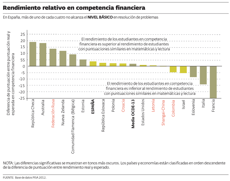 El hecho de que este último grupo incluya a los que han obtenido el máximo rendimiento, Shanghái-China, cuyos estudiantes muestran un mayor dominio de conocimientos financieros que cualquier otro país, aunque rara vez están expuestos a problemas dentro de contextos financieros en el centro escolar, demuestra que la cuestión de cómo desarrollar los conocimientos financieros sigue estando abierta a debate.