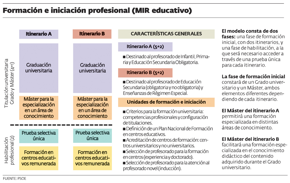 De esta forma, la propuesta socialista consta de dos fases. Por un lado, la fase de formación inicial (cinco años), con dos itinerarios, uno destinado al profesorado de Infantil, Primaria y ESO, y otro destinado al profesorado de Secundaria, Bachillerato, FP y Enseñanzas de Régimen Especial. Por otro lado, está la fase de habilitación (dos años), que conjugará la formación y el desempeño profesional remunerado en centros educativos propios de cada uno de los itinerarios. A esta fase de habilitación será necesario acceder a través de una prueba única, que será diferente dependiendo de cada itinerario.