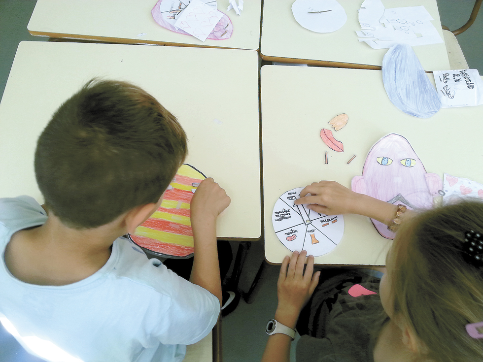 Después de hacer todo eso y poner el velcro, no tengo ninguna foto pero fue todo un reto entender el funcionamiento y calcular tamaños según cada pieza, les repartí una ruleta donde tenían que dibujar las diferentes partes y escribirlas, y después de recortarla y plastificarla poníamos una flecha en el medio con lo que se usa para los álbumes para permitir que ruede. Tuve que ayudar a varios porque era difícil para ellos abrirlo sin que quedara apretado, y cuando esto pasaba a flecha no giraba.