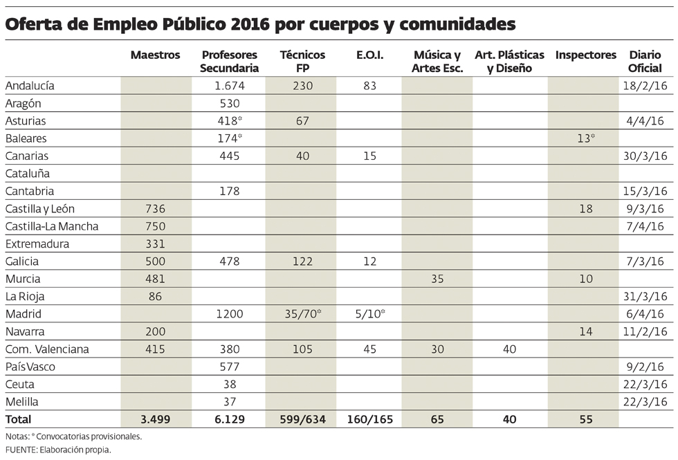 En total, se convocan 546 plazas, de las que 418 corresponden a ingreso libre para el nuevo personal funcionario docente, que se distribuyen en 30 especialidades mientras que las 128 restantes son puestos de promoción interna.