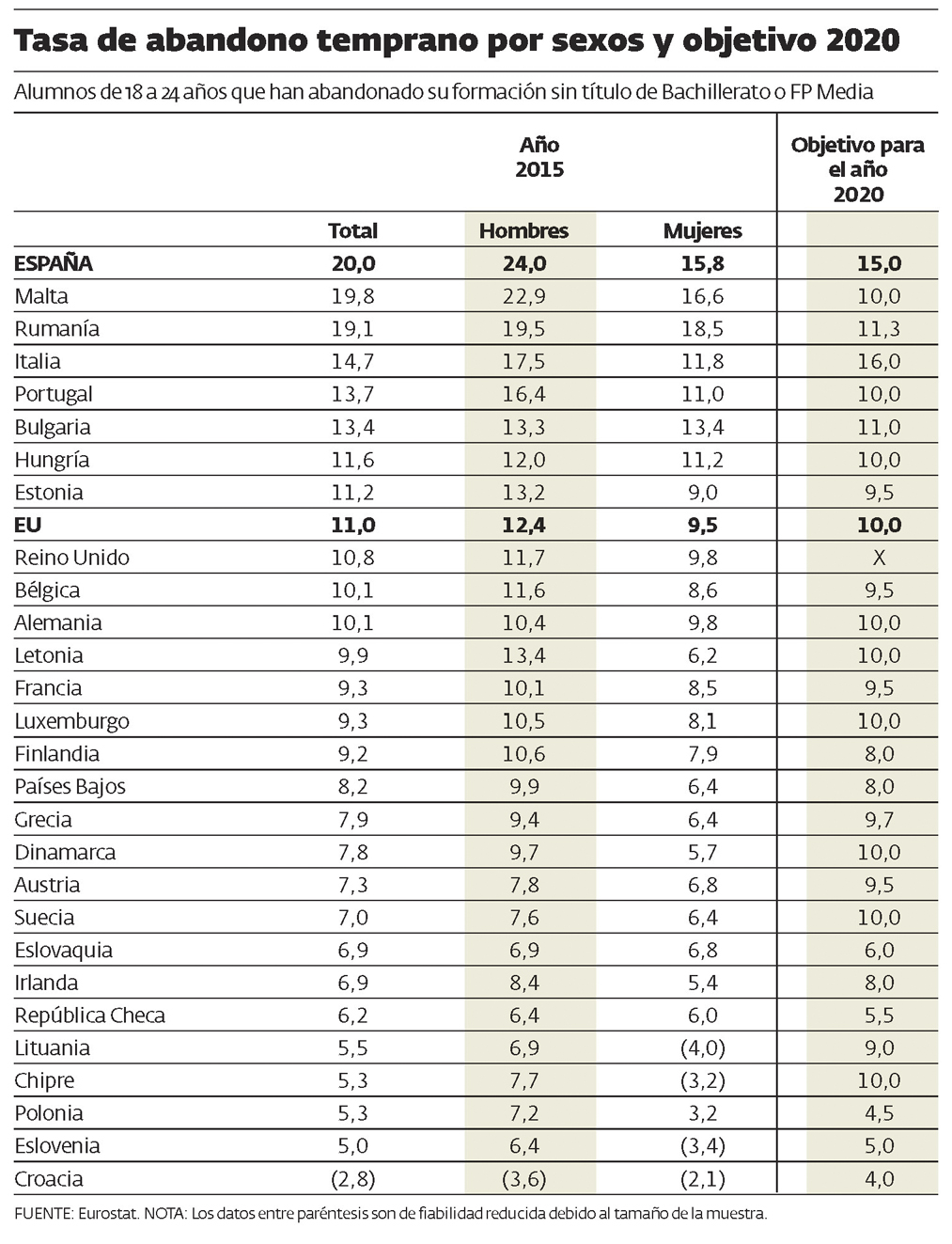 Según los últimos datos dados a conocer el pasado 27 de abril por Eurostat, en 2015 el porcentaje más bajo de abandono corresponde a Croacia (2,8%), Eslovenia (5%), Chipre (5,3%) y Polonia (ambos 5,3%) y Lituania (5,5%), mientras que los porcentajes más elevados se registraron en España (20%), Malta (19,8%) y Rumanía (19,1%).