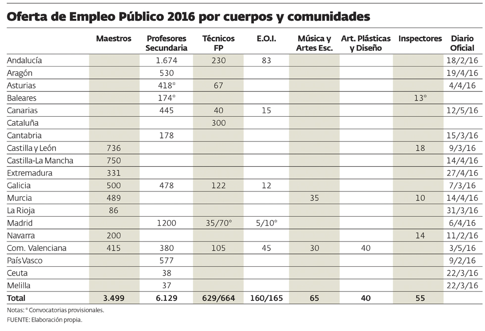 El proceso selectivo de esta convocatoria, correspondiente a la Oferta de Empleo Público de la Generalitat para el año 2015, está previsto que se realice durante el curso 2016-17. Asimismo, la Generalitat también tiene previsto realizar, antes de finalizar el próximo curso, el proceso selectivo correspondiente a la Oferta de Empleo Público de 2016 que sea aprobada.