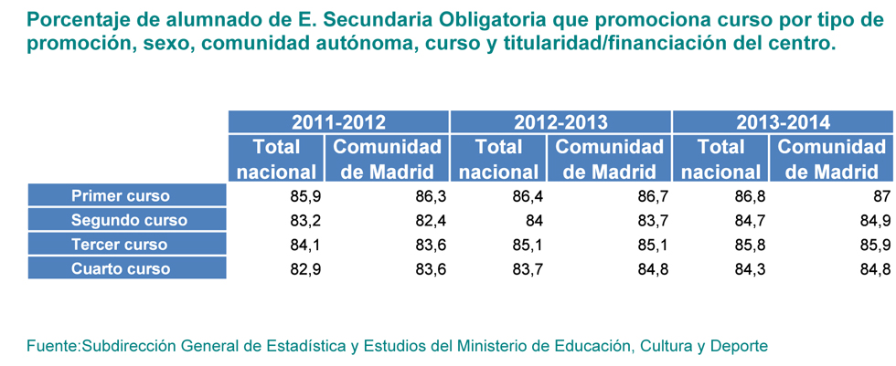 También, los jóvenes madrileños y españoles son cada vez más conscientes de la importancia de la formación para tener unas mejores perspectivas laborales y de satisfacción personal. En la siguiente tabla se puede ver el porcentaje de alumnado que promociona desde el curso 2011-12 al 2013-14. Así, por ejemplo, se ha incrementado los alumnos madrileños que promocionan en todos los cursos de la ESO desde 2011-12 a 2013-14. En 2º y 3º de la ESO esta mejora ha sido de más de dos puntos hasta alcanzar el 84,9% y 85,9% respectivamente en 2013-14. También, ha aumentado en España la proporción de estudiantes que promociona en todos los cursos de la ESO.