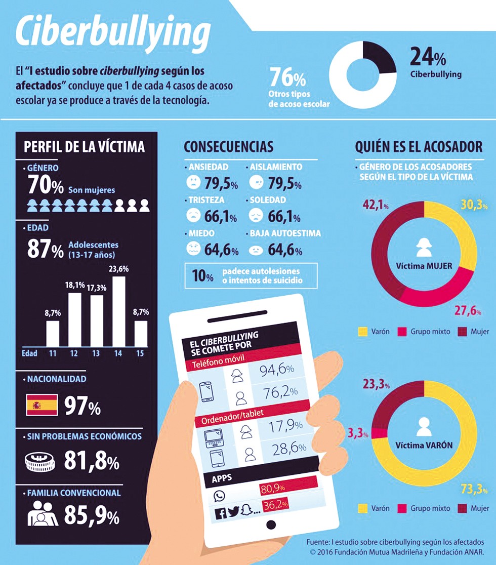 Las chicas son las víctimas del 70% de los casos de ciberacoso, un porcentaje diferente al acoso en general, donde los afectados están más equilibrados por sexos. El acoso a través de las redes sociales representa ya uno de cada cuatro casos.