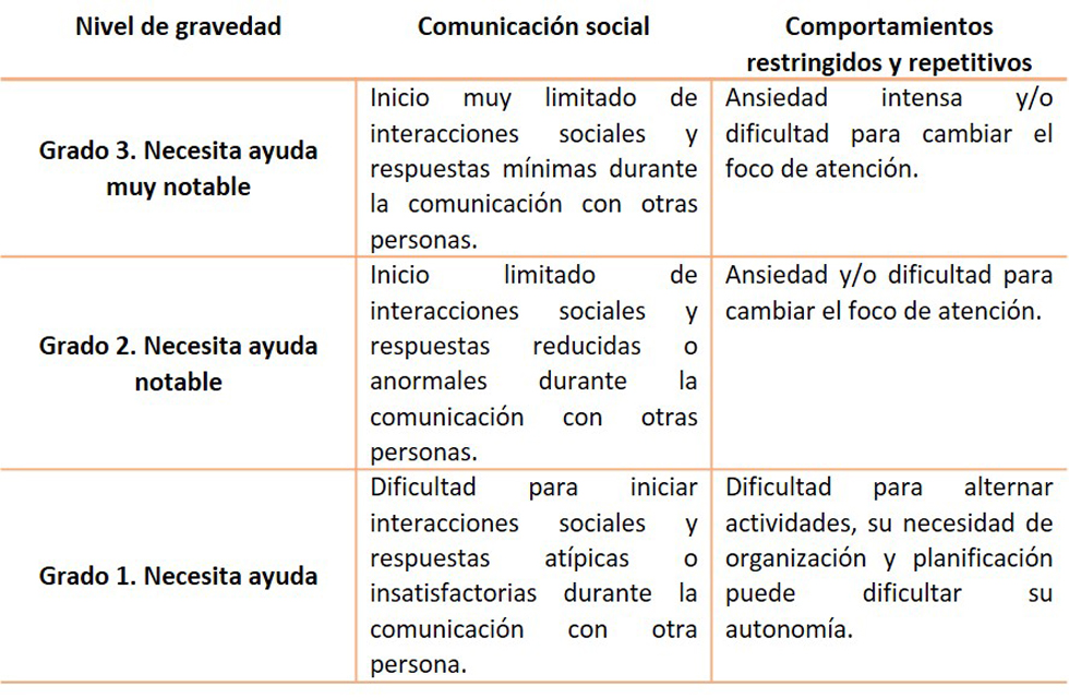 Los signos concretos de este trastorno dependen de la edad del paciente, el nivel de desarrollo y la gravedad de la afección. Se diferencian 3 grados de niveles de gravedad del trastorno, el primero sería necesita ayuda, el segundo necesita ayuda notable y el tercero necesita ayuda muy notable. En el cuadro 1 pueden comprobarse las características de cada nivel de gravedad.