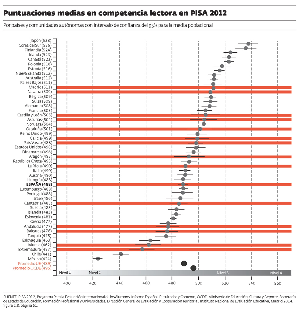 En competencia lectora, los resultados de España no son significativamente diferentes de países como Luxemburgo, Portugal, Israel y Suecia, por debajo de la media española, pero también de Islandia, Estados Unidos, Dinamarca, República Checa, Italia, Austria, promedio de la Unión Europea y Hungría, por encima de la media española.