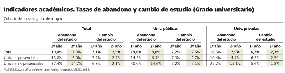 Según ese mismo informe, las tasas de abandono del sistema público son ligeramente superiores a las del sistema privado. En la universidad privada, el índice de fracaso es del 16,3% durante el primer año.