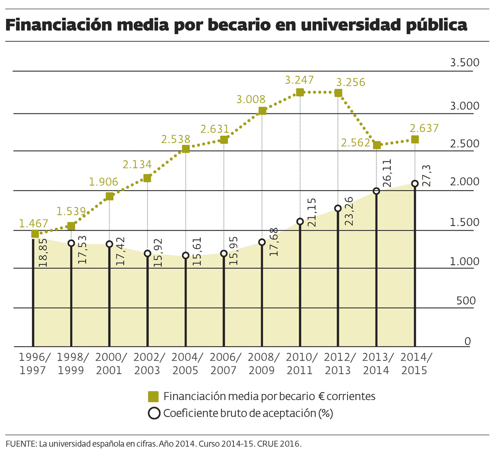 La financiación media por beca universitaria se reduce de 3.256 a 2.637 euros
