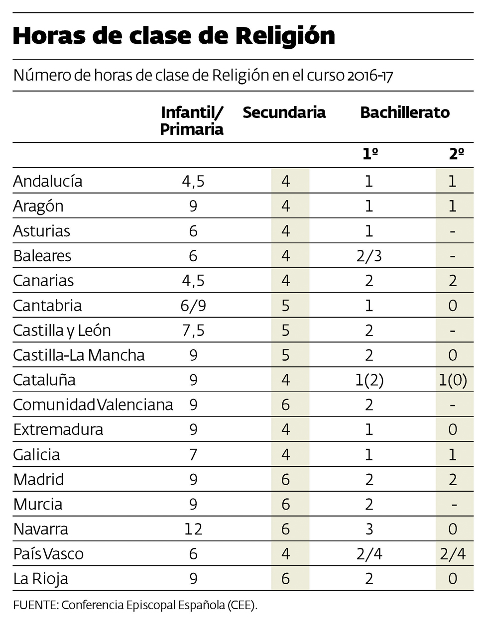 Andalucía y Canarias son las regiones donde menos horas de Religión se dan a la semana si se suman las ofertadas a los alumnos de Infantil, Primaria y Secundaria, ambas con 8,5 horas.