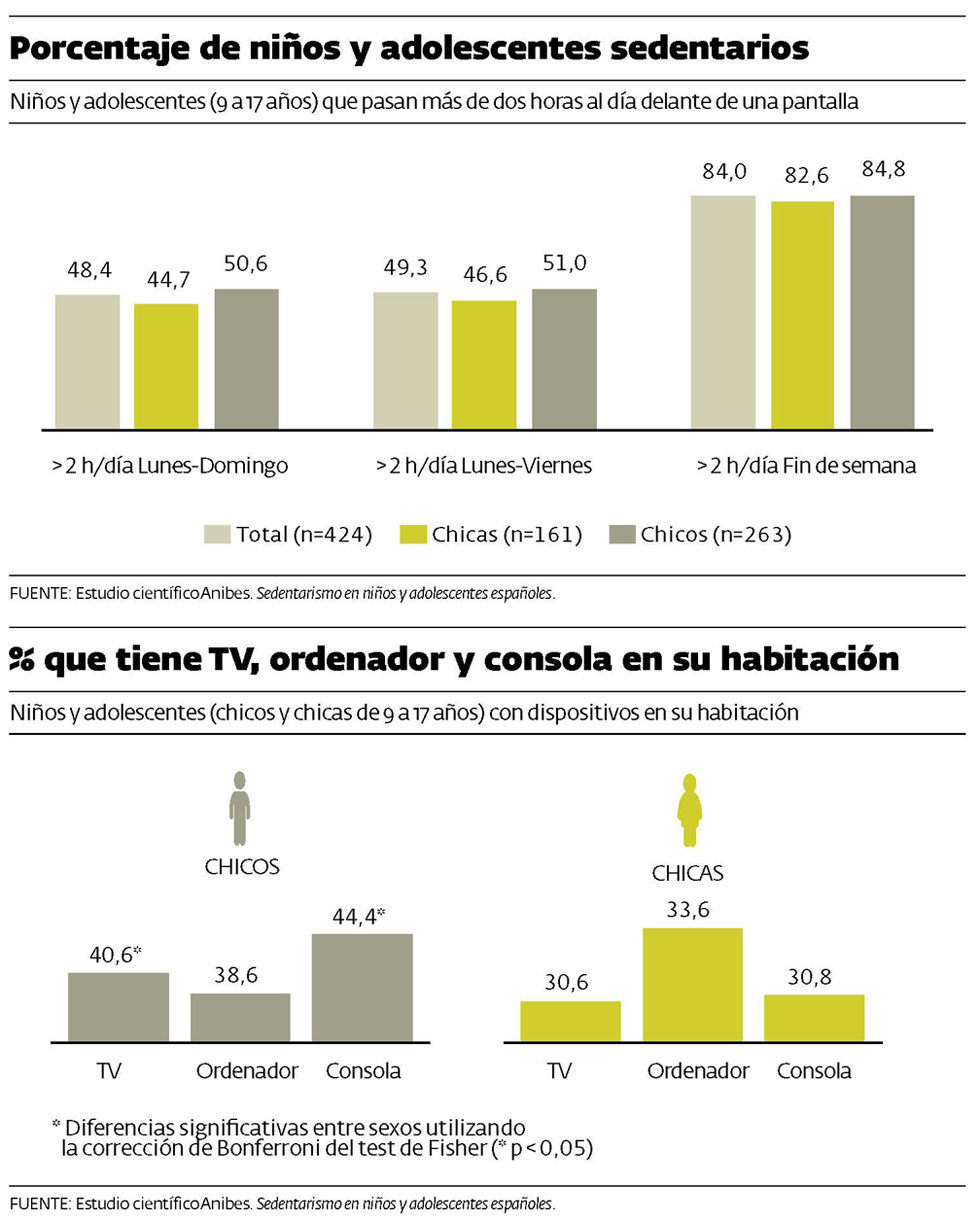De esta manera, el 48,4% del total de participantes (niños y adolescentes de 9 a 17 años) pasaba más de dos horas al día delante de una pantalla independientemente del día de la semana, el 49,3% superaba este tiempo en los días de entre semana, y el 84% durante los fines de semana.