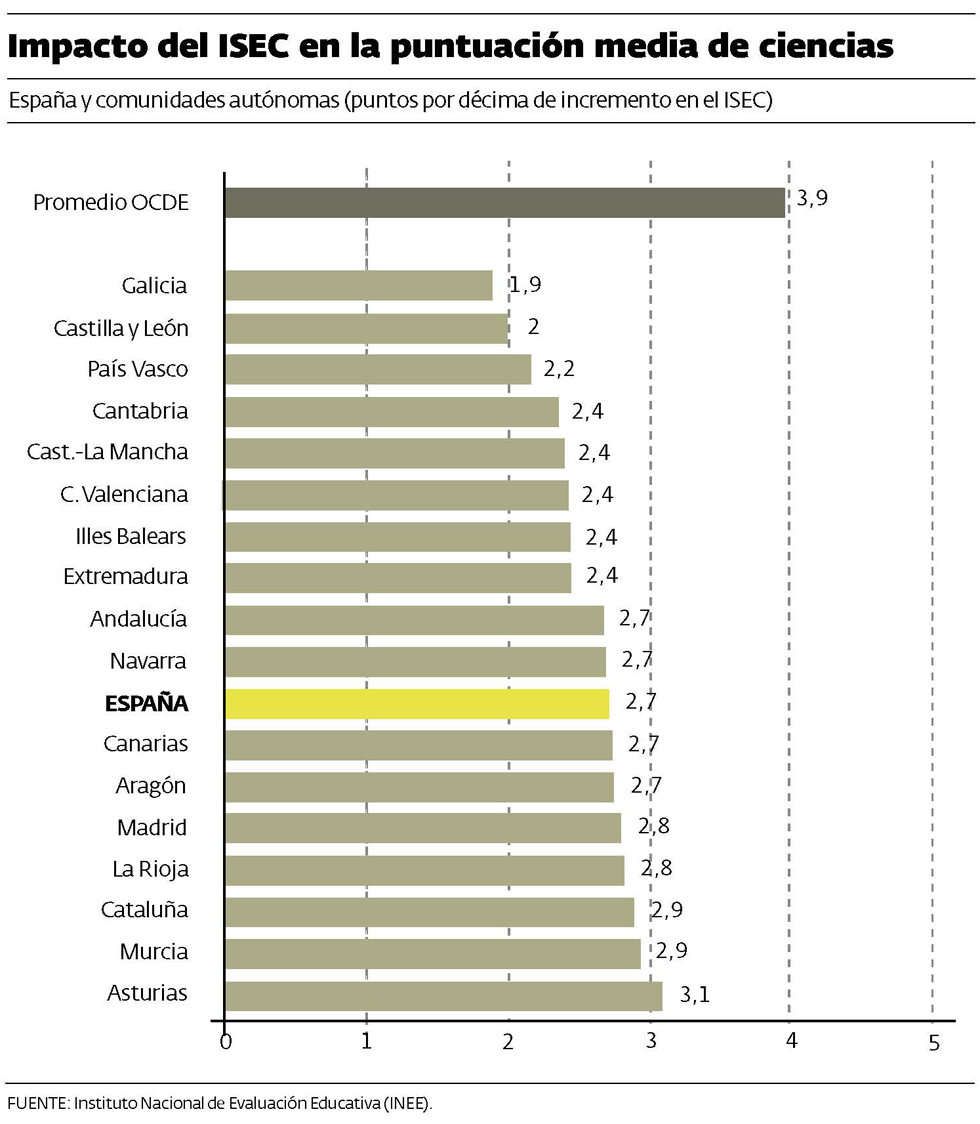 España, con 2,7 puntos/décima, se sitúa entre los países más equitativos de los seleccionados en PISA 2015. El promedio OCDE se encuentra en el 3,19. En cuanto a las comunidades autónomas, el impacto del ISEC es también menor que el promedio OCDE, según los datos del INEE.