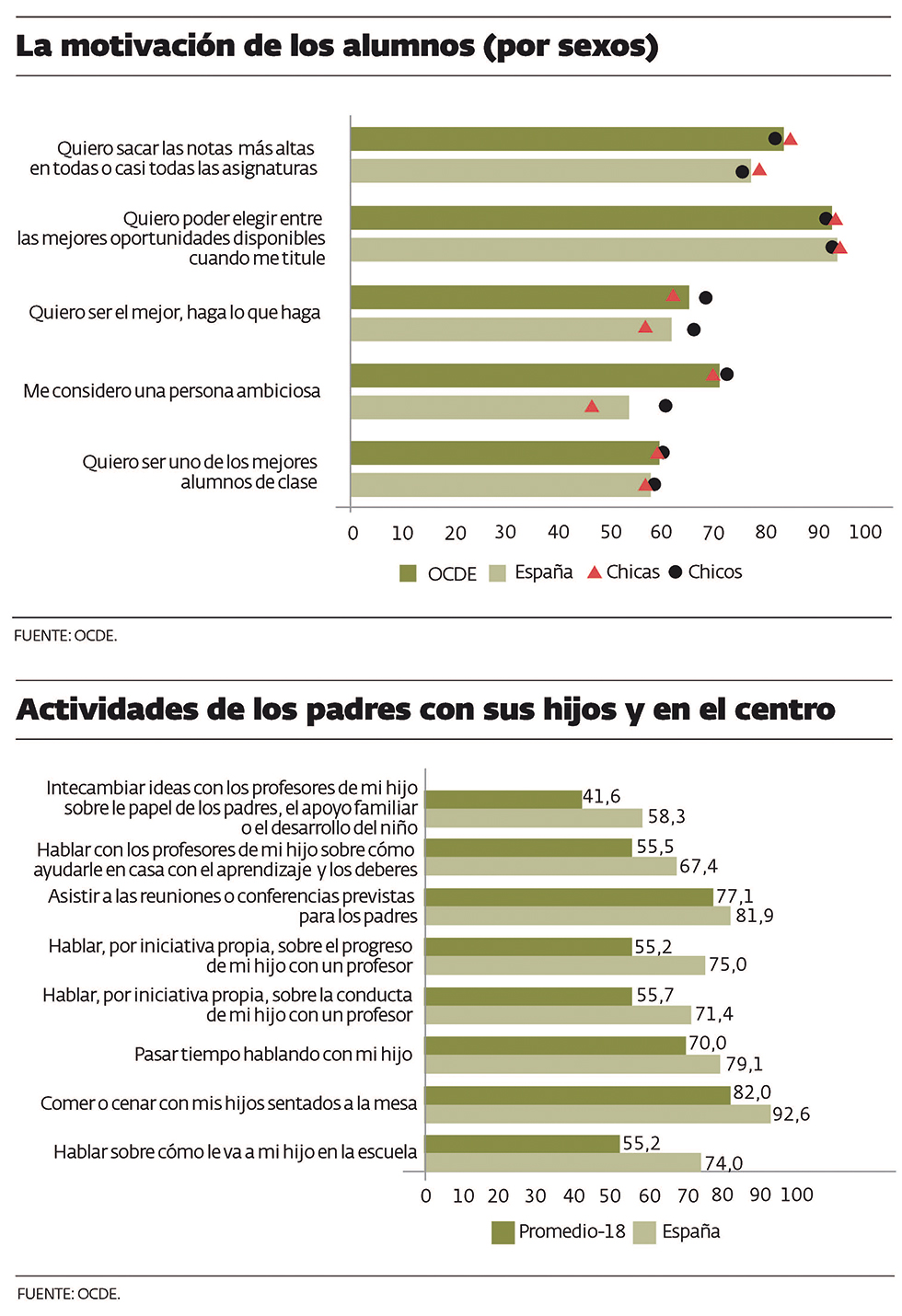 Asimismo, el 74% de los que estudian en España se sienten satisfechos o muy satisfechos con su vida personal (71% OCDE). Sin embargo, frente a otros países, los españoles se consideran ambiciosos en menor proporción (53% frente a 71% OCDE).