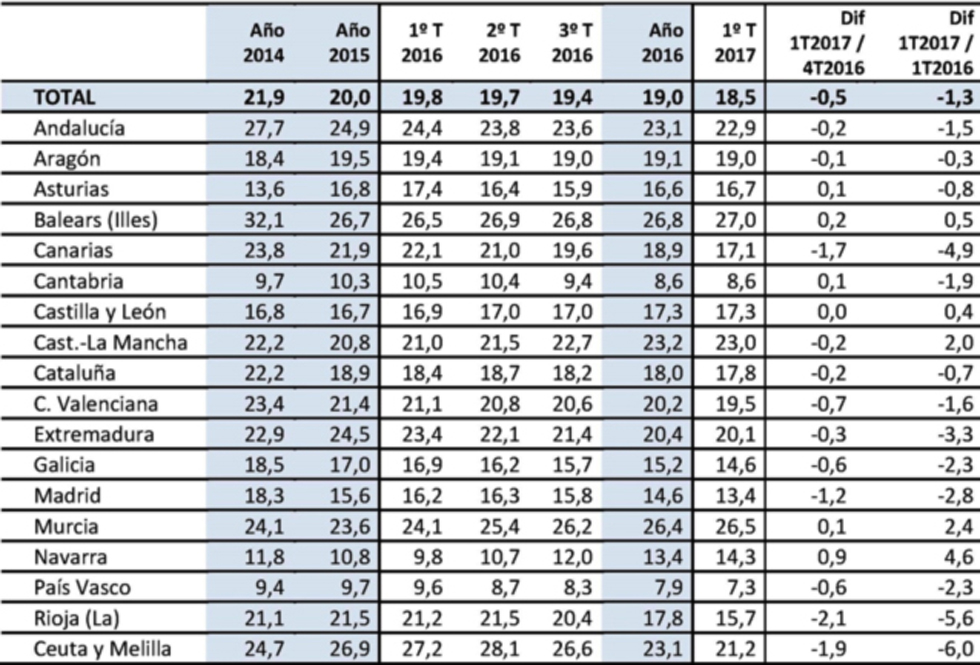 La media móvil disminuye 0,5 puntos respecto a la del trimestre anterior que corresponde al dato anual de 2016 cuando se situó en el 19%. Con respecto al primer trimestre de 2016, la media supone un descenso de 1,3 puntos.