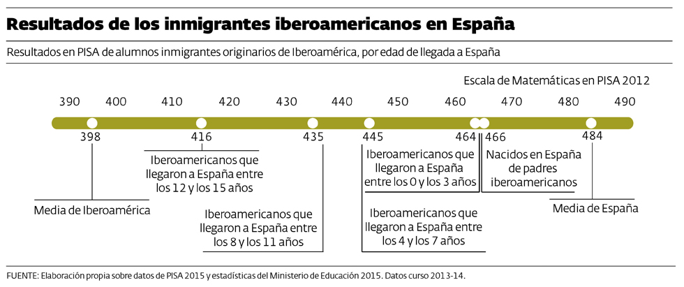 Para defender esta idea, el estudio plantea la hipótesis de cuáles resultados obtienen en PISA los alumnos inmigrantes en España. Según señala el estudio, “un ejemplo muy claro se observa si se analizan los resultados de los alumnos de los inmigrantes hispanoamericanos en España desde el punto de vista de su edad de llegada a nuestro país. Lo que se observa es que, a medida que estos alumnos llevan más años expuestos a un sistema educativo de mayor calidad que el de su país de origen, sus resultados en PISA mejoran notablemente. Esto es algo que la inteligencia no puede explicar por sí sola”.