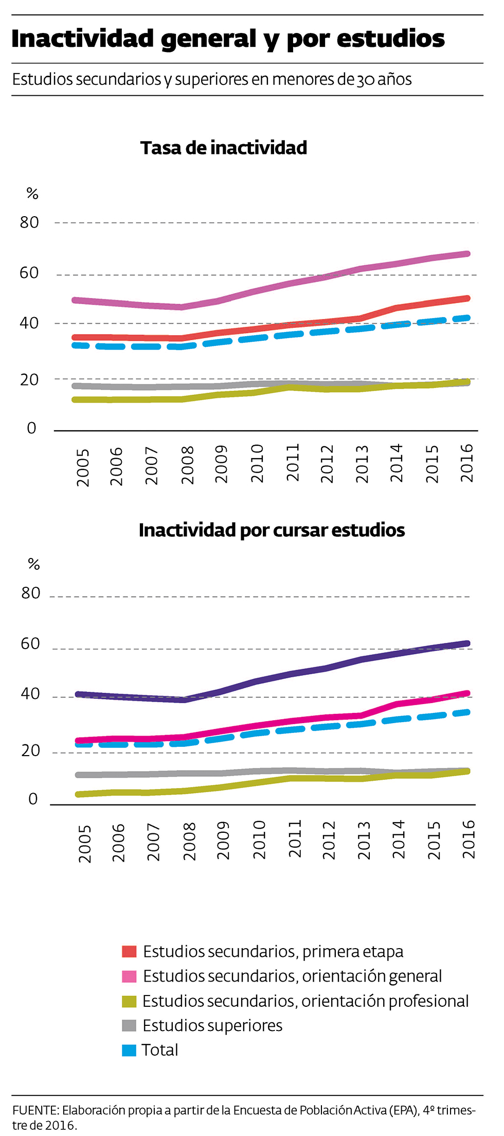 Los datos que recoge el informe afirman que, con la crisis se ha producido un incremento de la inactividad. En 2008 eran inactivos el 32,5% de los jóvenes menores de 30 años, desde entonces la inactividad ha llegado al 44,5% en 2016. La crisis económica provocó un cambio radical en la situación de los jóvenes que, aunque tuvieran poca cualificación, encontraban trabajo con facilidad. Por este motivo, la inactividad ha aumentado, no tanto por los que tenían estudios secundarios, entre quienes es más habitual continuar los estudios, sino por quienes tenían niveles educativos medios y bajos, que han visto en la vuelta a la formación reglada “una forma de mejorar sus probabilidades de integración laboral cuando el empleo vuelva a crecer”, afirma Cueto en el dosier.