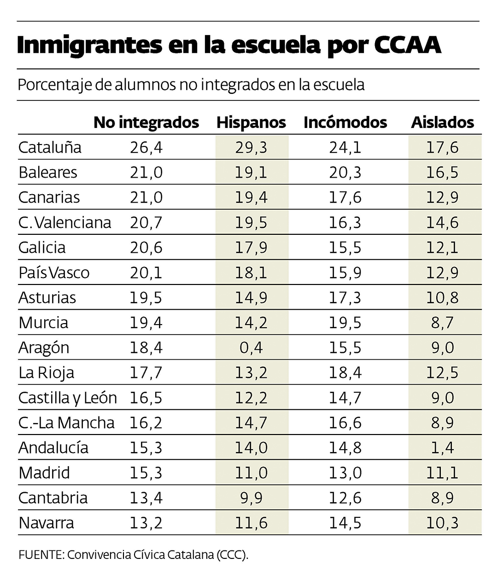 CCC concluye que el sistema educativo de Cataluña es “el que consigue menos integración del alumnado inmigrante de todas las autonomías españolas” y que los niños extranjeros que estudian en sus aulas son los que afirman sentirse menos integrados en su escuela, más aislados del resto y más incómodos y fuera de lugar en su centro. En particular, sostiene esta plataforma que los estudiantes de origen hispanoamericano se sienten “notablemente descontentos” en el sistema educativo catalán, ya que el 29,3% afirma que no está en absoluto integrado en la escuela en Cataluña.