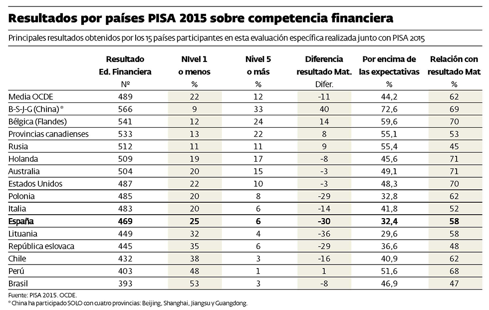 De hecho, España ha obtenido 469 puntos en el informe PISA 2015 sobre competencia financiera, con lo que se sitúa por debajo de la media de 489 de los 15 países que han participado en el estudio (diez de la OCDE, más cinco estados o regiones).