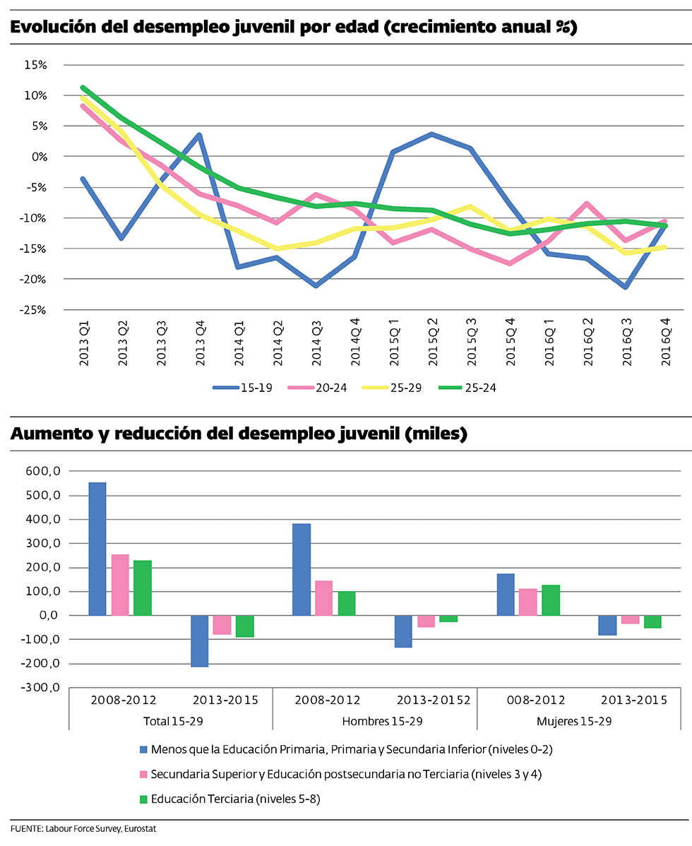 Esta reducción del desempleo juvenil no se debe al aumento de empleo para jóvenes, sino a la reducción de la población activa y de la población joven. De hecho, mientras que el desempleo entre jóvenes de entre 16 y 29 años ha disminuido en 382.000 personas en 2013-2016, el empleo de jóvenes solo ha aumentado en 21.000 personas. Esta aparente incoherencia se explica porque muchos jóvenes, sobre todo los menos cualificados, abandonan el mercado de trabajo. Por el contrario, es la juventud más cualificada la que está teniendo accediendo a empleos, aunque en una cantidad muy reducida.