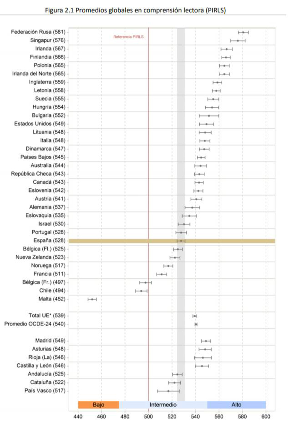 Los alumnos españoles participantes en el estudio internacional de progreso en comprensión lectora (PIRLS), realizado por la Asociación Internacional para la Evaluación del Rendimiento Educativo (IEA), han mejorado un total de 15 puntos, respecto a las mismas pruebas realizadas en 2011, pasando de 513 a 528, con lo que en ambos ciclos se han situado por encima de la referencia central de este informe. Esta evolución tan positiva solo ha sido superada en la OCDE por Australia, que ha mejorado 17 puntos.
