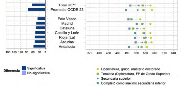 Dentro de España, comparándolo con las comunidades autónomas que han ampliado muestra, Madrid ocupa la primera posición (549), seguida de Asturias (548), La Rioja (546), Castilla y León (546), y por encima de Andalucía (525), Cataluña (522) y País Vasco (517).