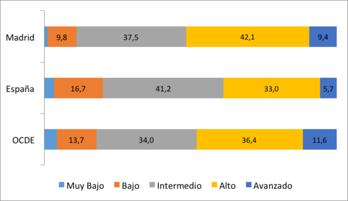 Además, el nivel de excelencia en lectura es también muy elevado en Madrid, superior al de países como Francia, Bélgica, Noruega y Países Bajos. Concretamente, un 9,4% de los alumnos madrileños alcanza el nivel más alto, el “avanzado”, superior al 5,7% de España. Más de la mitad de los alumnos madrileños (51,5%) se encuentran en los dos niveles superiores (“alto” y “avanzado”) de rendimiento, frente al 48,0% de la OCDE y el 38,7% de España.