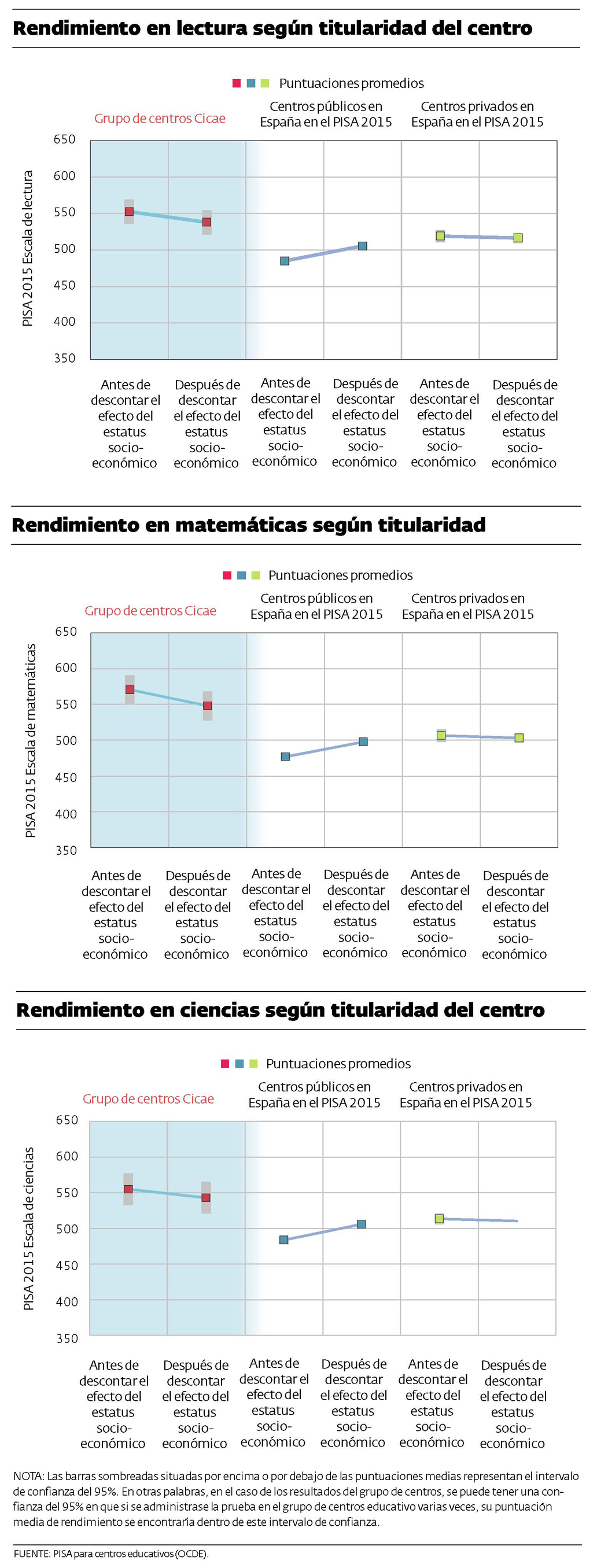 La semana pasada conocimos que 20 colegios privados de la asociación Círculo de Calidad Educativa (Cicae) obtenían mejores resultados en PISA para centros que los mejores países en el informe general de la OCDE (PISA 2015). Los gráficos que reproducimos en esta página muestran cuál es el rendimiento de los alumnos de este grupo de colegios en lectura, matemáticas y ciencias comparados con los alumnos de los centros públicos y privados en general de España en PISA 2015.