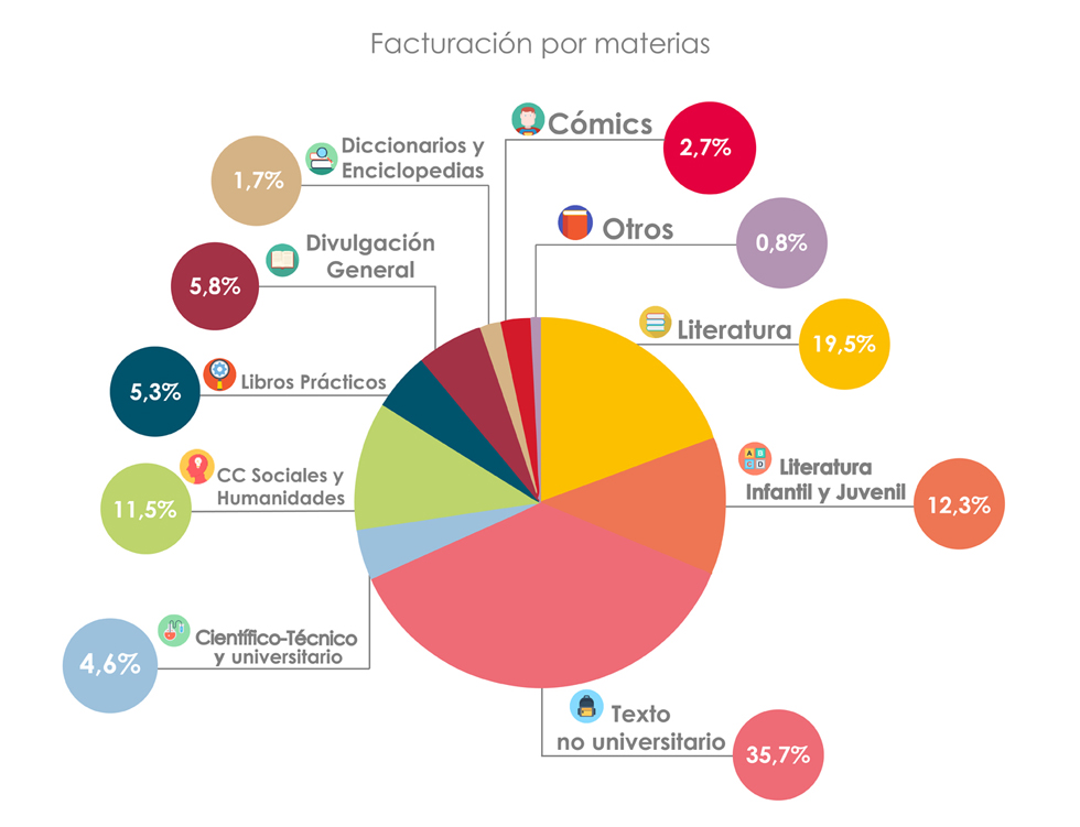 Todos los géneros literarios crecen, tanto en adulto como en infantil, 1,0 y 3,2 por ciento respectivamente. También crecen los libros científico-técnicos y universitarios, un 4,3% más; los de ciencias sociales y humanidades, un 2,2% más; los libros prácticos, más 3,3%, y los cómics, un 4,2% más. Los libros de divulgación general se mantuvieron, mientras que descendieron los diccionarios y enciclopedias.