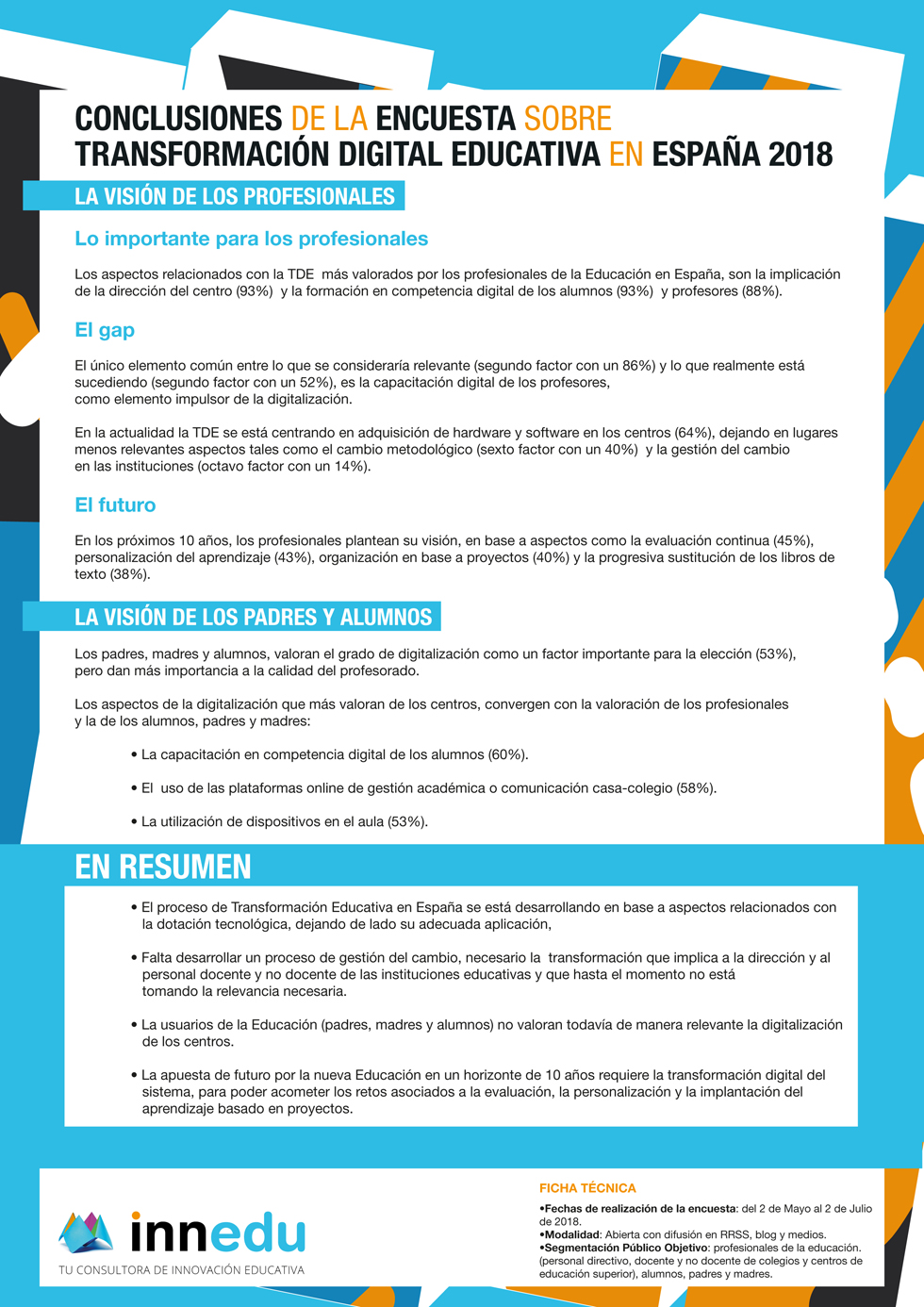 La consultora de Innovación Educativa Innedu, ha dado a conocer los resultados de la encuesta Presente y futuro de la Transformación Digital Educativa en España, aplicada entre los meses de mayo y junio a profesionales de la Educación (personal directivo, docente y no docente de colegios y centros de educación superior), alumnos, padres y madres.
