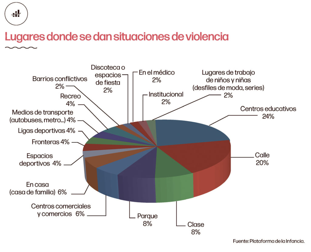 El informe recoge que los niños y adolescentes, por el mero hecho de ser “pequeños” sufren situaciones de violencia en distintos ámbitos. Los chicos señalan los centros educativos y la calle como los lugares donde más horas pasan, como espacios donde se producen situaciones de violencia contra la infancia.
