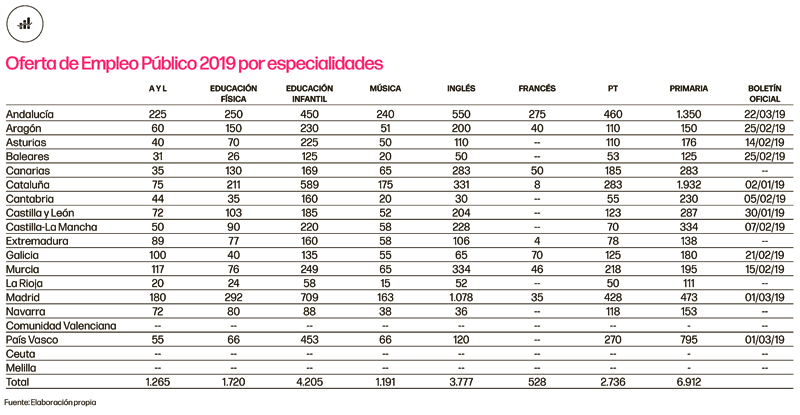 Para Pedagogía Terapéutica se convocarán 185 plazas, seguida de Educación Infantil, con 169; Educación Física, con 130; Música, con 65; Francés, con 50; Audición y Lenguaje, con 35; y se completará la convocatoria con las 10 plazas para Inspección Educativa. Canarias es de las pocas comunidades autónomas que sigue sin publicar la OPE para el Cuerpo de Maestros 2019, junto a Andalucía o Extremadura. A pesar de ello, las oposiciones del archipiélago pisan fuerte este año, ya que en 2017 se aplazó la convocatoria de oposiciones a maestros y se retrasó hasta el 2019. De este modo en la Mesa Sectorial de Educación de Canarias, la administración educativa y la representación sindical, acordaron la convocatoria de 1.210 plazas.