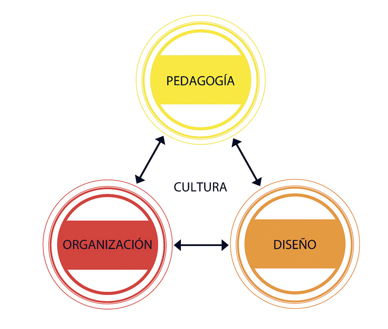 El proceso de cambio de los espacios no puede tratarse de manera aislada, sino que el diseño físico debe ir de la mano de la pedagogía y la organización de una institución. Juntos, forman una tríada que es la base para poder cambiar la cultura escolar.