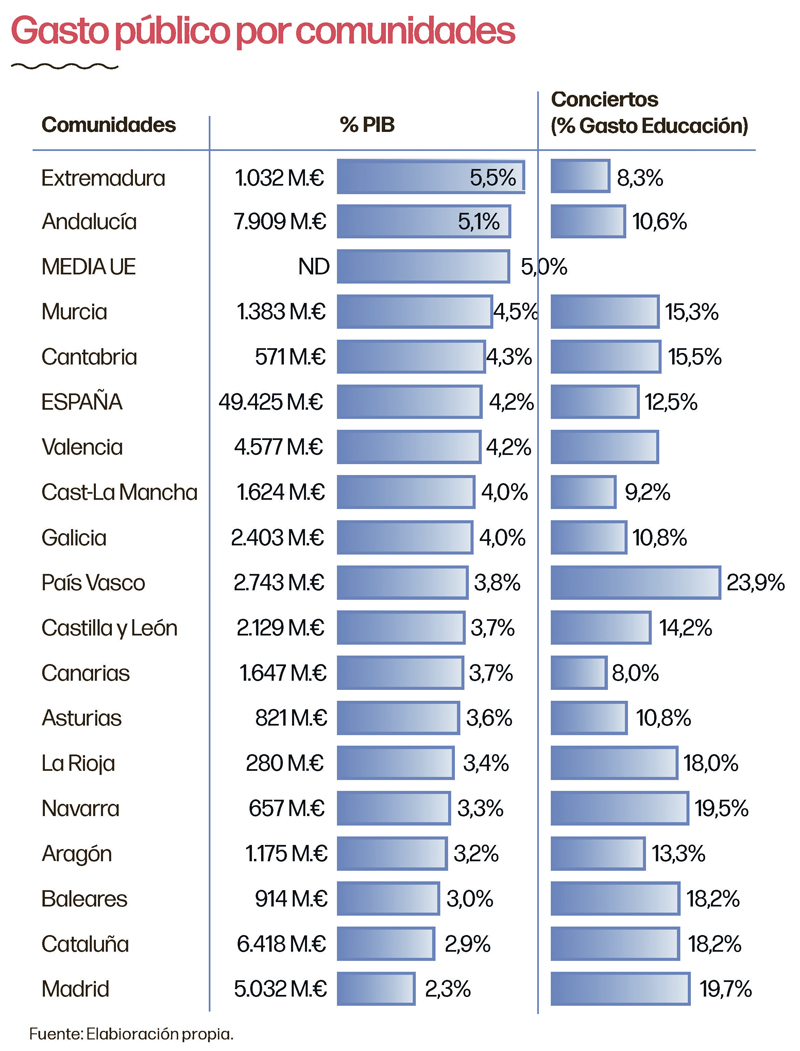 Extremadura, la que más gasta en Educación, Madrid la que menos