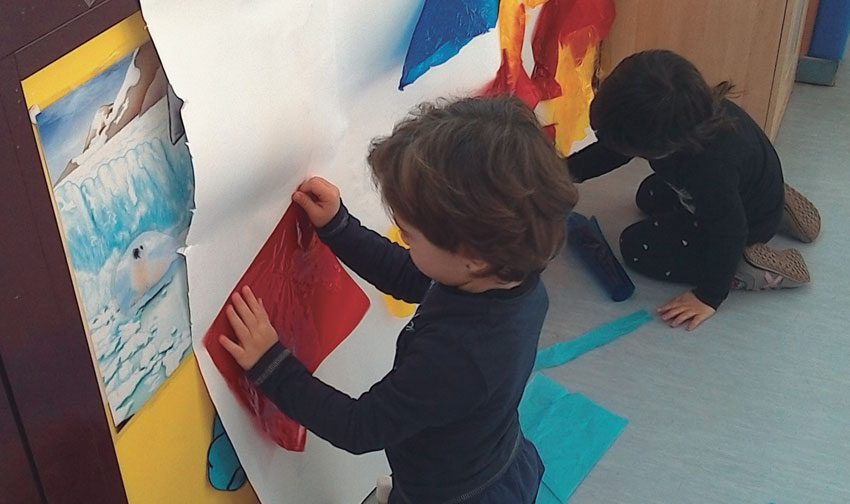 En varias sesiones, se cantaba la canción de Picasso mientras la escenificábamos y se les hacían propuestas para manipular diferentes utensilios, materiales y pinturas, donde los niños crearon un mural con diferentes materiales y colores.